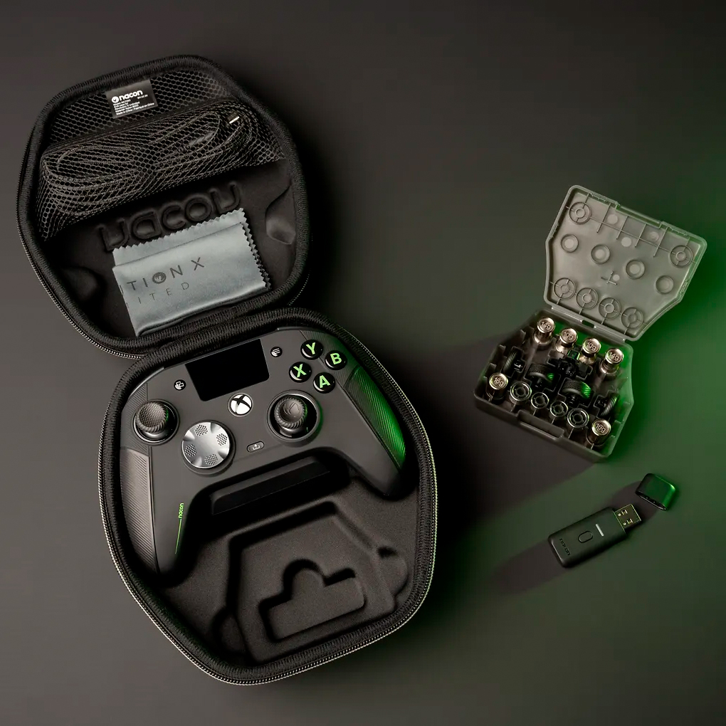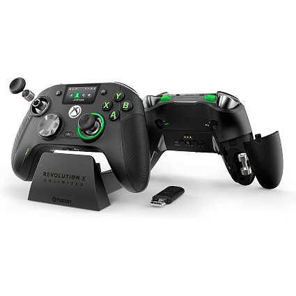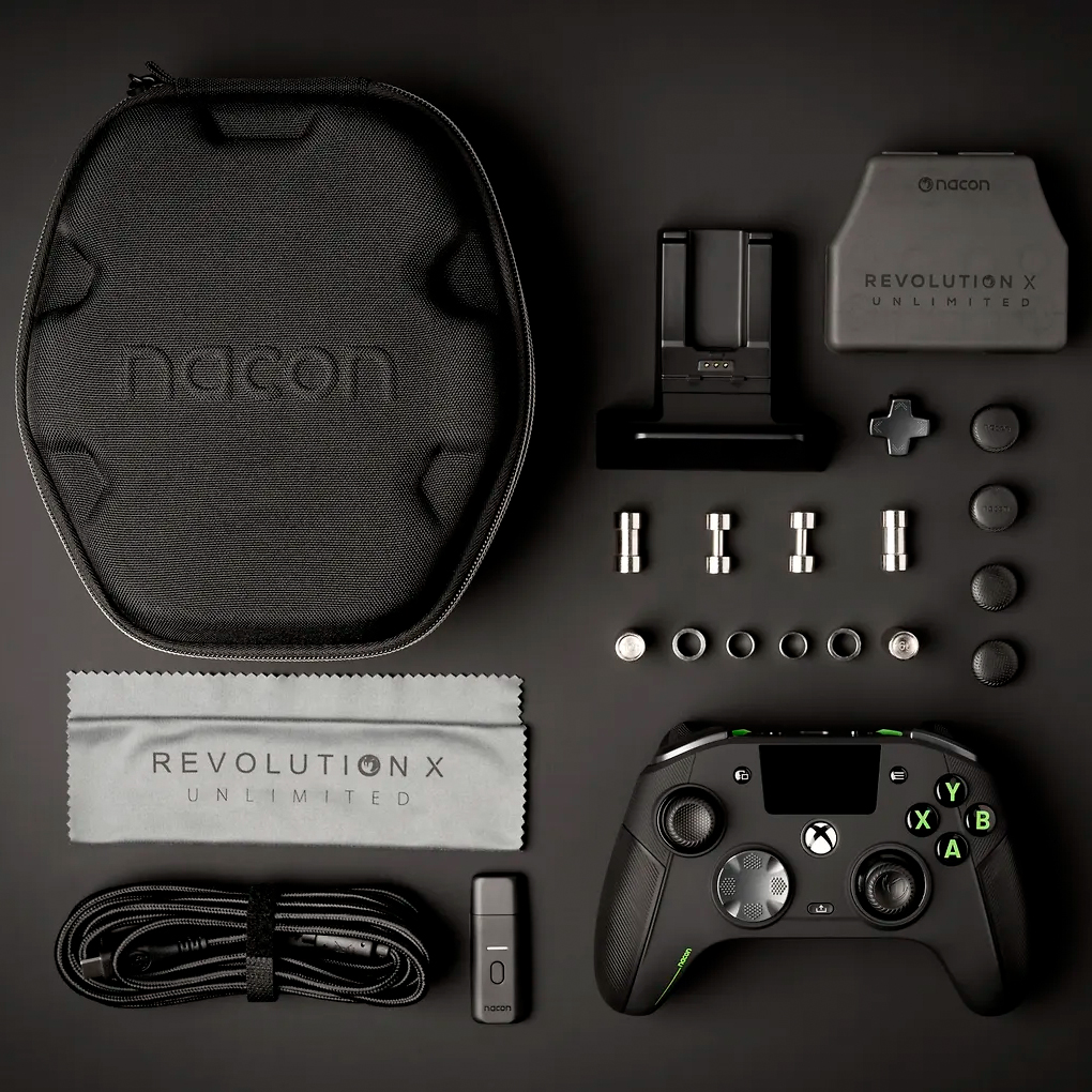 - В комплекте Геймпад Nacon Revolution X Unlimited; USB-донгл 2.4 ГГц (USB-A); кабель USB-A→USB-C 3 м (USB 2.0); набор утяжелителей (3 пары: 10 г, 14 г, 16 г); 6 насадок для стиков; 2 сменные крестовины (4-направленная и 8-направленная); жёсткий кейс для хранения; док-станция для зарядки и хранения; документация