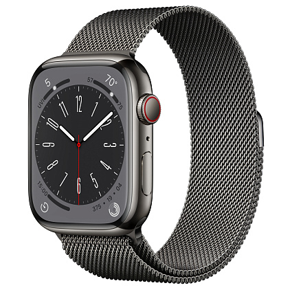 - Короткое название Умные часы Apple Watch Series 8 (GPS + Cellular) 45 мм, корпус из нержавеющей стали графитового цвета, графитовый браслет мила