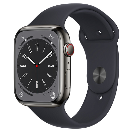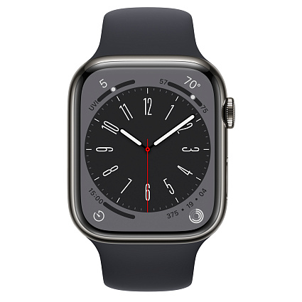 - Короткое название Умные часы Apple Watch Series 8 (GPS + Cellular) 45 мм, корпус из нержавеющей стали графитового цвета, спортивный браслет цвет