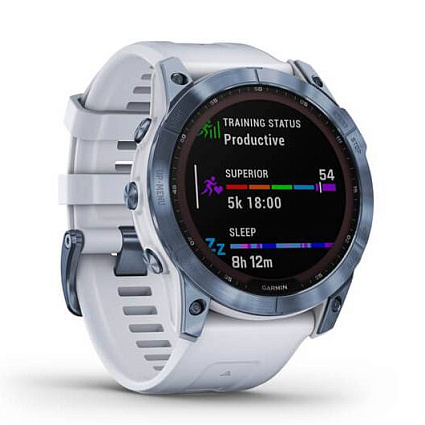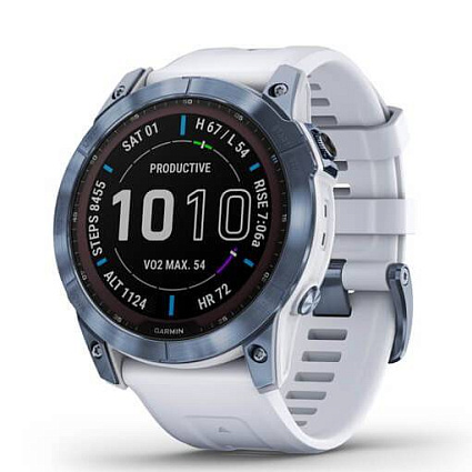 - Короткое название Умные часы Garmin Fenix 7X Sapphire Solar титановый синий минерал DLC с белым ремешком